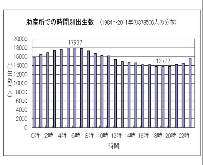 医療介入がない助産所で生まれている赤ちゃんの割合は、【図1】のように、全体の1%弱だけです。1984年から2012年までに、助産所で生まれた全ての赤ちゃんで作った、時間別の出生数グラフが【図2】です。朝に少し増え夕方に少し減る、きれいな海の波のようなリズムがあることがわかります。