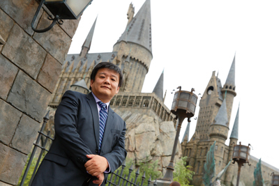 今年7月にオープンしたアトラクション「ウィザーディング・ワールド・オブ・ハリー・ポッター」の象徴・ホグワーツ城と森岡さん(写真・さとうわたる)