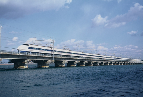 浜名湖を行く100系。東海道新幹線初の2階建て車両 (写真提供=JR東海)