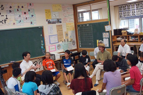 長野県木島平村立木島平小学校6年1組の子どもたちのインタビューを受ける前川喜平さん(文部科学審議官、左の白シャツ)と筆者(右の帽子)。2014年8月17日