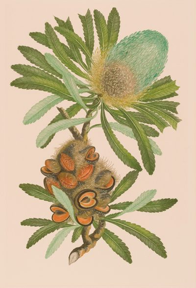 『バンクス花譜集』の半数近くを占めるのがオーストラリアの植物で、バンクスの名を冠した「バンクシア・セラータ」は、完成度の高い作品のひとつだ。バンクスとともに調査に加わり、銅版画のもとの絵を描いた画家、シドニー・パーキンソンは、寄港地のバタヴィア(現在のジャカルタ)でマラリアに罹患し、命を落とした。まさに命がけの航海だっただけに、未知の植物発見にかけたバンクスの情熱が偲ばれる。