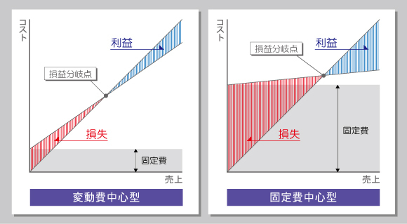 図の総コストと売上が等しい損益分岐点を真ん中に見て、右側が利益ゾーン、左側が損失ゾーンだ。ホテルのような固定費中心型では、売上の上下によって大きく利益が変動することがおわかりいただけるだろう。