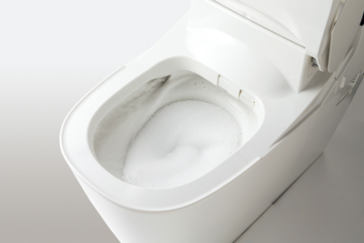 初代モデルから好評の自動洗浄は、台所用の中性洗剤を泡立てて便器に自動投入し「スパイラル水流」という渦巻きを起こして洗い流す方式。便器内部の形状は、渦巻きができやすく、かつ便の跳ね返りを抑制する設計としている。