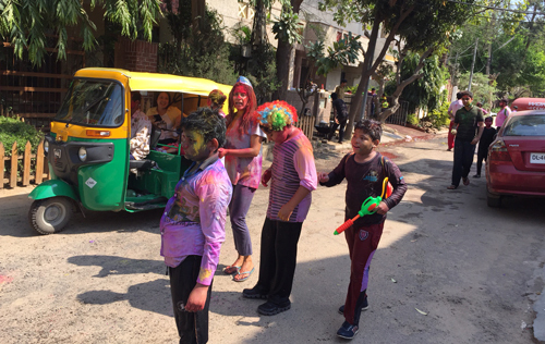 古参駐在員のアドバイスに従い、捨ててもよい古着を来て、先生宅へ。オートリキシャ(三輪バイクタクシー)が玄関に着くと同時に、近所の子どもに水風船をぶつけられて、早速、半濡れ。先生宅で、後で色粉を洗い流しやすいようにと、オイルを顔に塗り、iPhoneと財布を部屋に置いて、いよいよ参戦です。