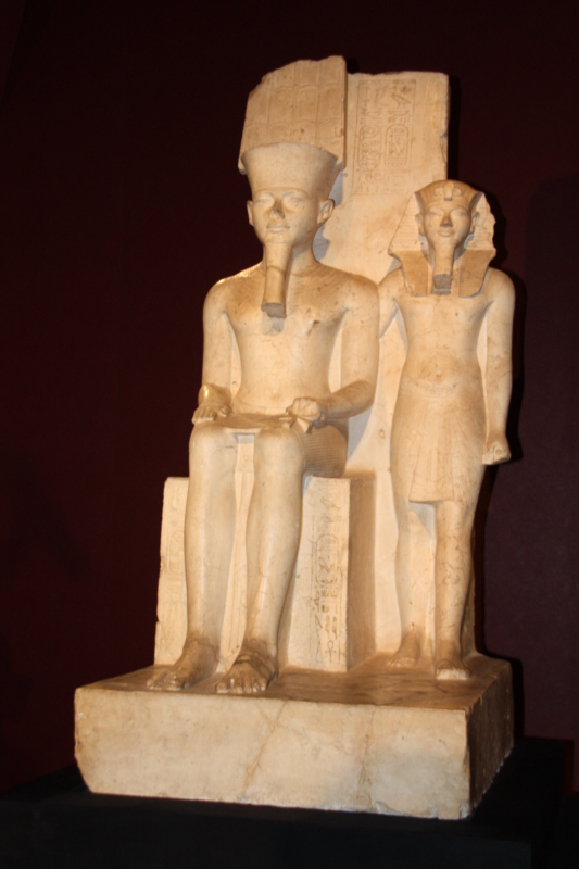 「アメン神とツタンカーメン王の像」 背後にある壁は赤色。