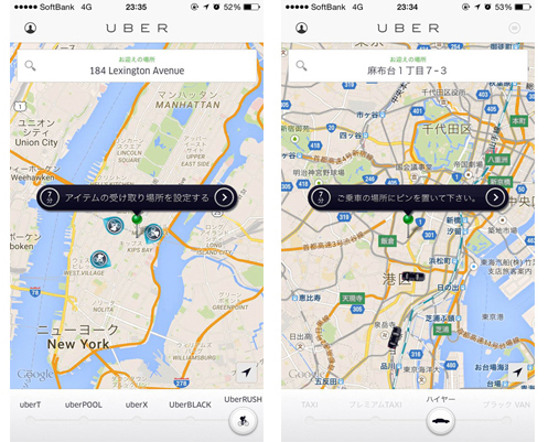 UBERのスマホアプリは、世界共通。左はニューヨークの「UBER RUSH」、右は東京のハイヤー拡大画像表示