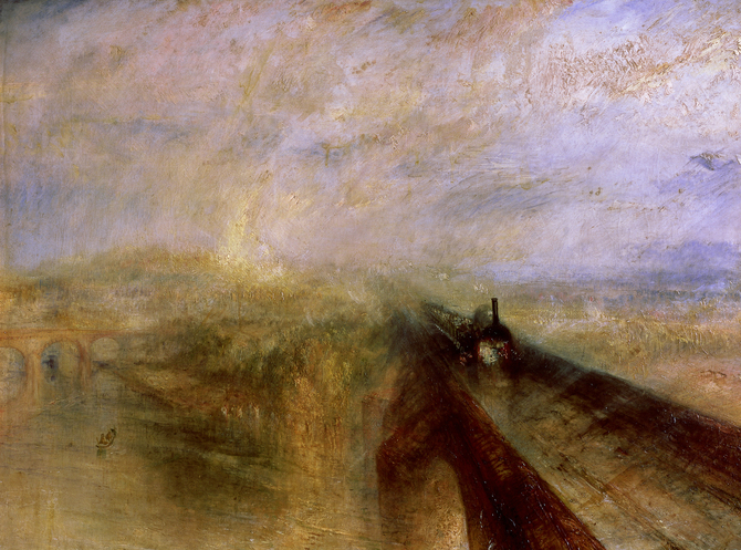 あるとき、放送が始まったばかりの「美の巨人たち」というテレビ番組で、ターナーの「雨、蒸気、速度ーグレート・ウエスタン鉄道」という一枚の絵の特集を見た。作家のターナーはイギリスを代表するロマン主義の風景作家であるが、それまで作品はおろか名前も聞いたことがなかった。番組はその絵の描かれた時代や作家の歴史やエピソードなどを詳しく解説してくれる。テムズ川にかかる橋を渡る機関車が、雨と機関車のはき出す蒸気が混じった独特の大気感の中に描かれている。そして絵の中には、その蒸気機関車の前を必死で逃げていく野うさぎがいるという。テレビでアップで映されても、それが野うさぎだとは思えない。もちろん、知らずに絵をみても絶対に気付かないだろう。