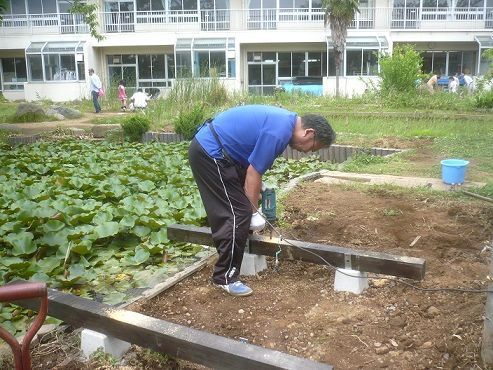 秋津小学校の校庭に10年以上も前に手づくりしたビオトープの大池に縁側的に張り出した板部改修の基礎工事に励むおじさん