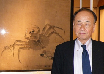 辻館長。背後の作品は 「蟹・牡丹図衝立」一基の内「蟹図」 個人蔵