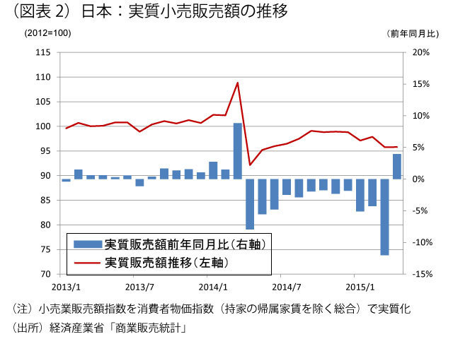 もっとも、これは消費税引き上げ後に駆け込み需要が大きく落ち込んだ昨年4月の1年後に当たったからに他ならない。実際、実質販売額は盛り返しておらず、消費税引き上げ前の13年平均に比べると5%ほど低い水準に止まっている(図表2)。
