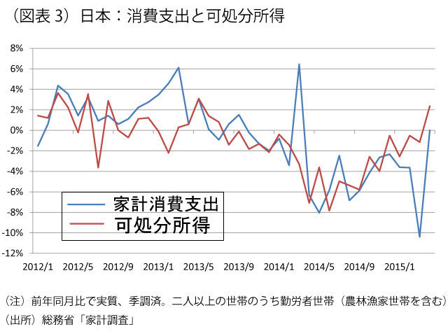 では、個人消費は回復していないのかというと、そうでもない。消費支出と可処分所得には相関があるが、この4月の家計の実質消費支出は減少が止まった上に、実質可処分所得は13年7月以来の前年同月比プラスとなった(図表3)。