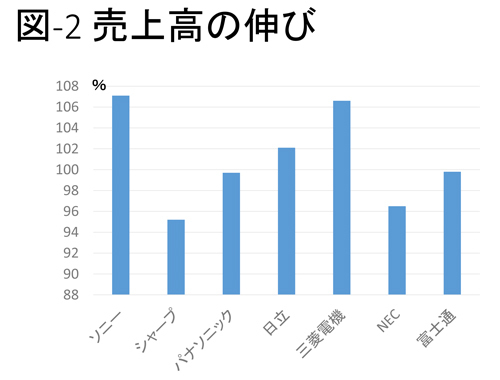 総資産利益率は図-1、売上の伸びは図-2に示されている。シャープ、ソニーは収益性に見劣りがする。加えて、後ほどみるようにソニーの営業利益は金融部門に依存しており、金融の利益がなければ、営業利益の段階でソニーは赤字であることから、ソニーの製造部門の収益力は他社との比較で大きく見劣りする。収益性の偏差値は表-1の通りだ。
