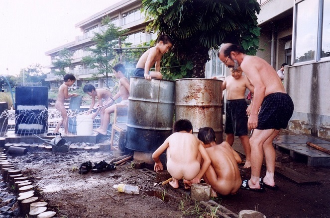 秋津小学校の校庭の手づくり井戸の水をドラム缶に汲み入れて、裸になりお風呂を楽しむ秋津っ子たちとおじさん(実は筆者)