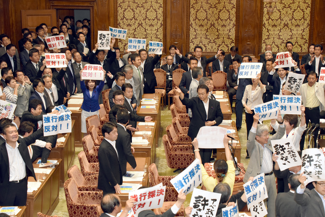 7月15日午前、衆議院の平和安全法制特別委員会での一コマだ。安倍晋三内閣が提出した安全保障関連法案がこの日、委員会で強行採決されるのを阻もうと、野党議員が委員長席に詰め寄っている場面だ。