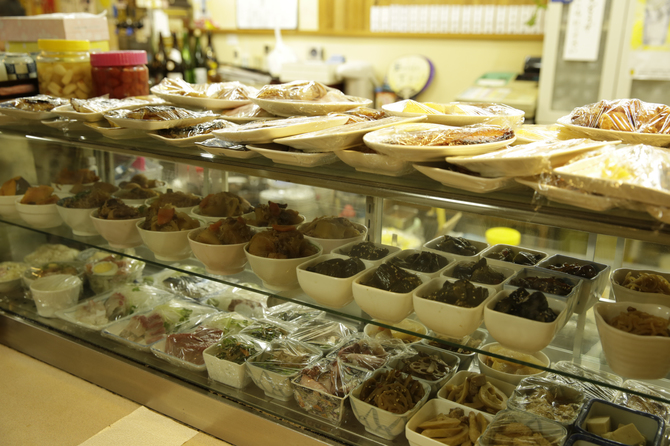 ショーケースには、30~40種類の小鉢が並ぶ。壁にかかる短冊状の品書きと合わせて注文。ポテトサラダ、刺身、肉じゃが、キンピラ……。どれも素朴な母の味。