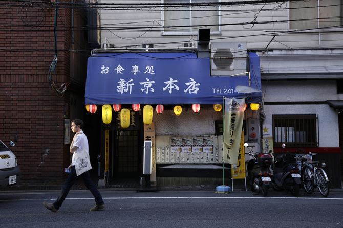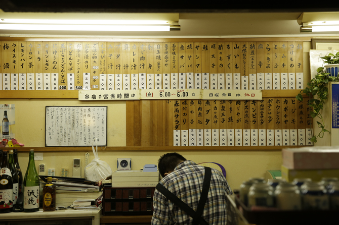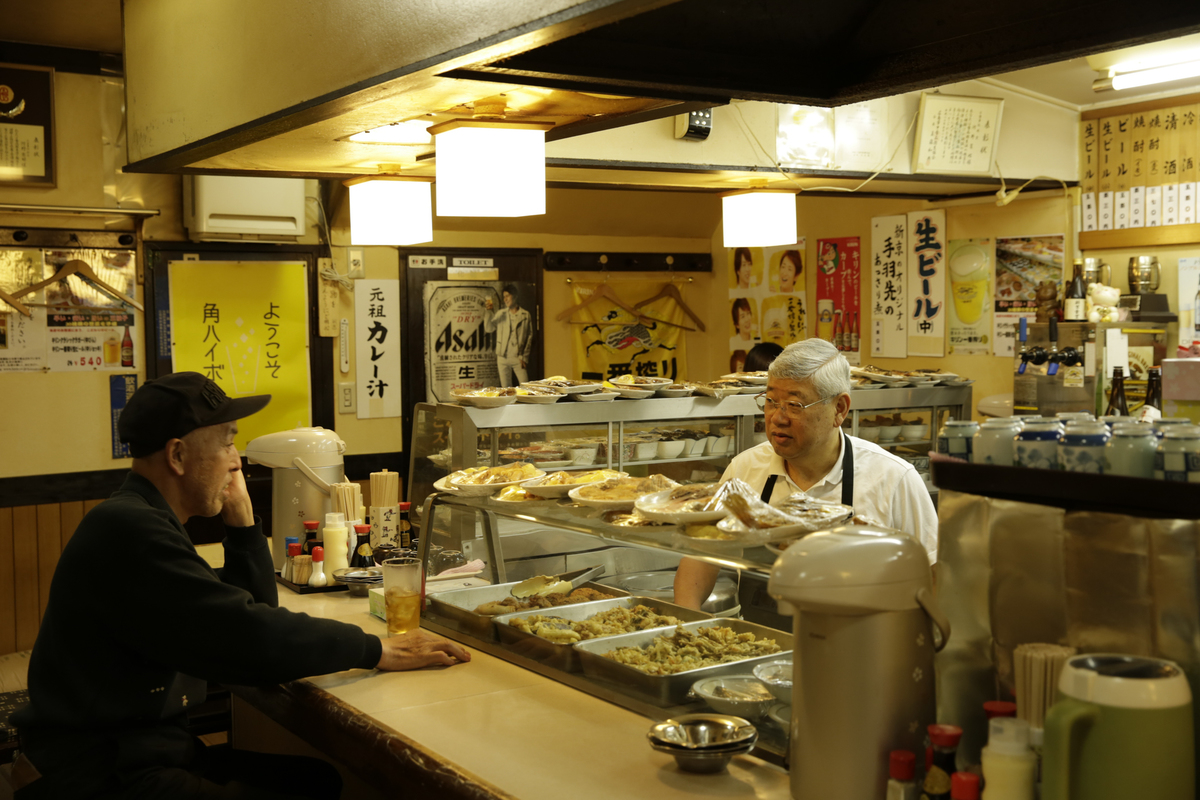 仕事の後先、ぱぱっと食事を済ませる人や、しみじみお酒を味わう人。新京本店のカウンターでは、客それぞれの過ごし方がある。