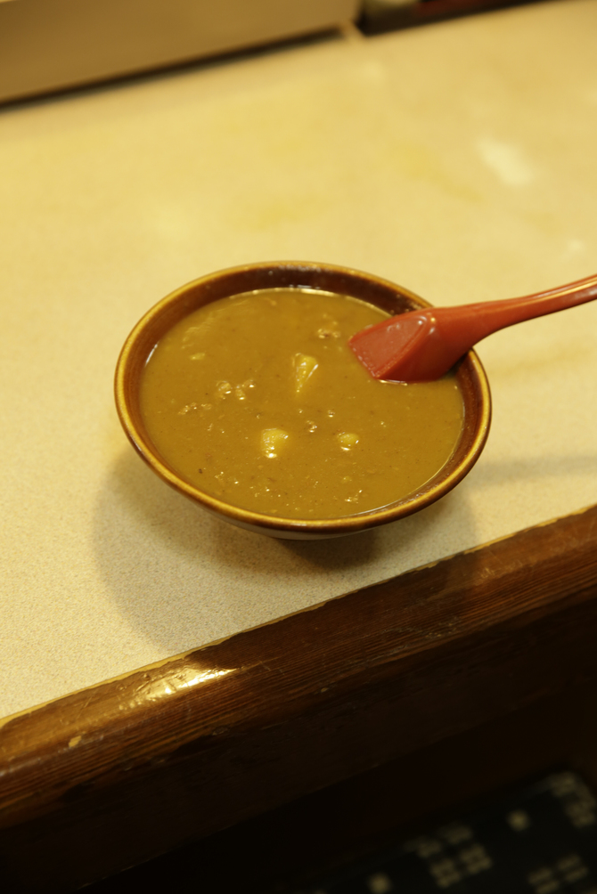 名物の「カレー汁」。カレーを和風のだしでスープ仕立てに。さらりとした喉ごしで、ぴりりと辛い後味。夜も賑やかな繁華街で、お酒のあとのシメの定番。