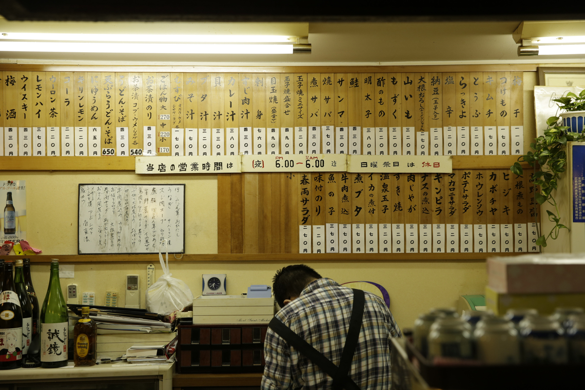 創業は終戦すぐの昭和20年。なにもかもが焼けてしまった町の中、前を向いて生きる人たちを力づけてきた、カウンター17席の大衆食堂。今の営業時間は、日が暮れる夕方18時から、朝日がまぶしい翌朝6時まで。日曜・祝日は休みをとっているけれど、昔は365日、24時間営業していたこともあった。当代主人は3代目。仕込みは女性で売り手は男性と、分担制で店を回しているという。まずはビールに口をつけ、ショーケースを覗き込む。なすの煮浸しを注文すると「温めますか?冷たいままで?」と、ちゃんと好みを聞いてくれる。ごはん茶碗を中心に、数品のおかずで食事をとる人もいれば、酒場かわりにしっぽりと飲む人も。けれどもへんに長居する人はそうおらず、さくっと食べてさくっと飲み、次の人に席を譲る。これから広島を旅するたび、この店で一日が終わるだろう。