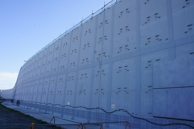 浜岡原発の防波壁。高さは14~16メートル、海抜22メートルで「万里の長城」を連想させるほど壮観だ