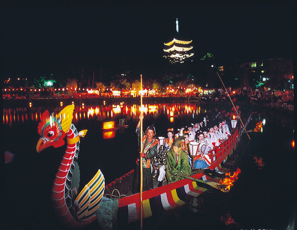 ライトアップされた興福寺の五重塔を背景に、 池を巡る管絃船 奈良市観光協会=写真提供