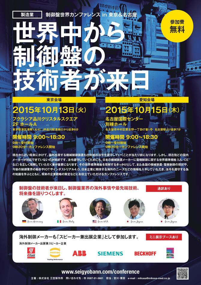 今や、「発注に対して見積もりを出すのが追いつかないほど」仕事が舞い込んでいるという。この勢いに乗って、石田社長が開催を計画するのが、「制御盤世界カンファレンス(サミット)」だ。10月13日に東京(品川)、15日に名古屋で開催する。国内外の業界関係者に「三笠製作所」をアピールする狙いだ。提携するドイツ、イタリア、アメリカの技術者をゲストスピーカーとして招くほか、独・シーメンスなど欧州の大企業からの協賛・ゲスト参加も決定している。会場内には協賛企業の各海外制御メーカーの展示ブースを設け、見学ができると共に協賛企業のスピーチも聴講できる(※参加費は無料)。