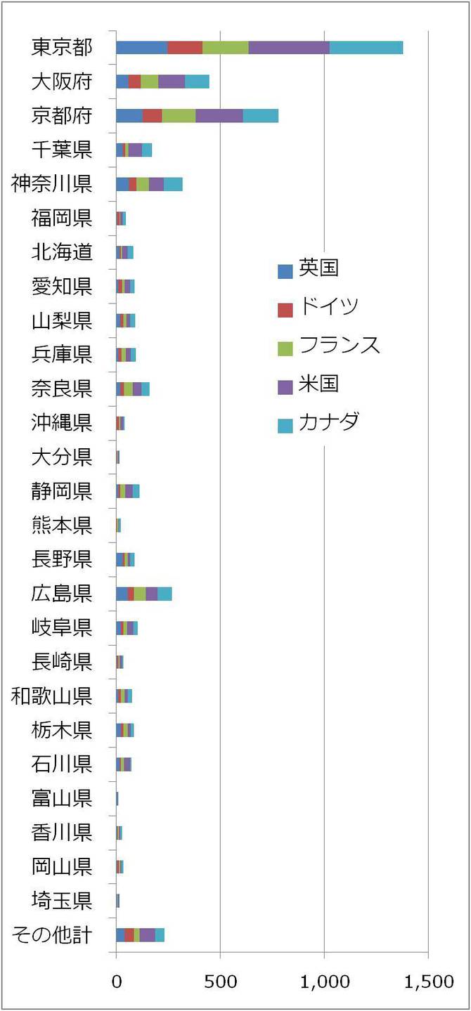 【欧米からの観光客が訪れた都道府県(人)】観光庁の「2014 訪日外国人消費者動向調査」より筆者作成拡大画像表示
