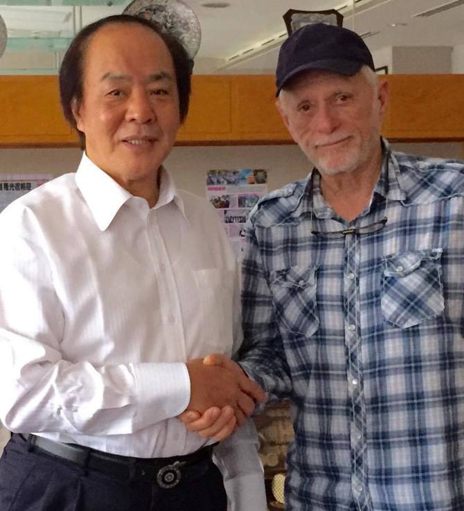 静岡県伊東市の佃弘巳市長と握手するリック・オバリー氏。「親善大使に任命された」とうそぶいた(オバリー氏のサイトより 削除済み)