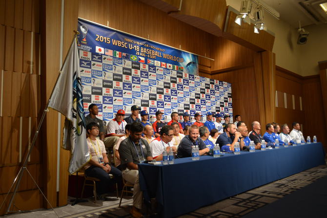 大会には世界12の国と地域からU-18代表が参加。開幕前日には監督とキャプテンが会見に臨んだ。開会式は大会初日8/28に舞洲球場で行われた。