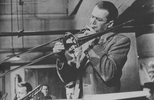 ジャズトロンボーン奏者として名高いグレン・ミラーは、自らの楽団を率いて軍隊への慰問演奏をして回り、その移動中に飛行機事故で亡くなった。写真は、映画『グレン・ミラー物語』でグレン役をつとめるジェームズ・スチュワート。