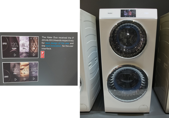 左)スマホと本体が共通のソフトでコントロールされる旨を書いたパネル。 右)その技術が採用された、ハイアール”DUO”。日本メーカーとは違う発想に立つ。