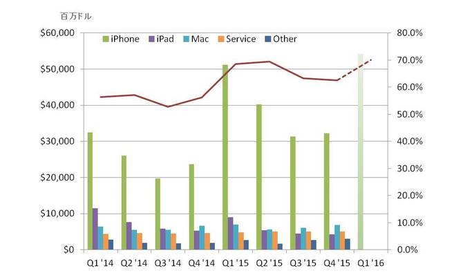 グラフは四半期ごとの各製品の売上げ額を示している。その他(Other)には、Apple TV、Apple Watch、Beatsのヘッドホン、iPod、そしてオンラインと店舗のアップルストアで販売されるサードパーティー製を含めたアクセサリーの売上げがまとめられている。全体に占めるiPhoneの売り上げの割合を、折れ線で表してみた。2015年度は60%を超えている。