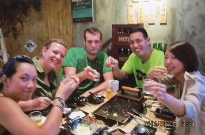 焼肉専門店にて欧亜混成部隊の5人。ビールの次は眞露ロックで乾杯