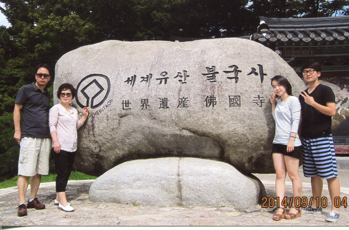 “仏国寺”の世界遺産登録の石碑前で記念撮影する中国人一家