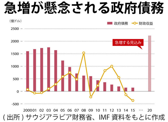 原油安により石油輸出収入が15年は前年比半減しており、サウジをはじめほとんどの中東諸国が財政赤字に陥っている。IMFは20年までに、中東諸国の財政赤字は1兆ドルに達すると想定する。