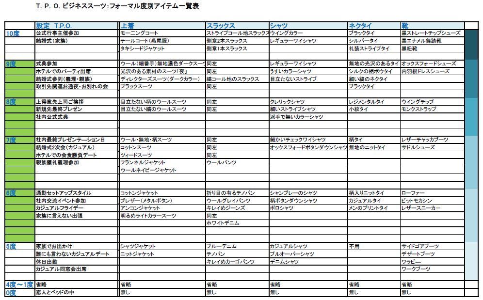 細かくて見にくいかもしれません。T・時間とP・場所とO・オケージョンをまとめて相応しいアイテムを一覧表にしました。フォーマル度の高いモノから低いモノをアイテム別に一覧表にしてみました。わかり易くご理解頂けるはずです。組合せを一覧としました。フォーマル度10度は正に正装です。0度は下着も付けない状況です。下着を着て1度。見方ですが10度のみ同じ10度のものしか合わせられません。しかしその他の度数では上下度数の上下1段づつも可能です。下の度数のアイテムを増やす程カジュアル化します。