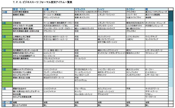 良く服装はTPOとの言葉を耳にします。Tはタイム、Pはプレイス、Oはオケージョンです。つまり時と場所と場合に合った服を選ぶという事です。TPOは良く出来ているのですが和製英語です。実は個々の言葉を理解できてもビジネスシーンとどう関連するのか。服を選ぶ基準は何なのか。まるで外国為替レート並みに予想不可能な印象を受けるでしょう。男性のTPOは外国為替で言えば固定レートです。米ドルと香港ドルの為替関係と同じです。この固定レートを生かしてわかりやすい表を作りました。名付けて秘伝「たかぎ式フォーマル度数一覧表」です。ご覧下さい。