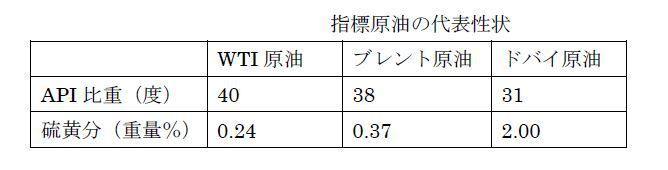 WTI原油と、北海産ブレント原油と、中東産ドバイ原油である。3種は性状が異なる。現物市場ではAPI比重の大きいほど、硫黄分の少ないほど良質とされる。