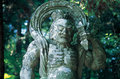 両子寺の阿吽仁王像のうち、向かって右に立つ阿形像。左手に金剛杵(こんごうしょ)を肩上に構え、右手は腰の位置で拳(こぶし)にしていて、その容相は猛々しい拡大画像表示
