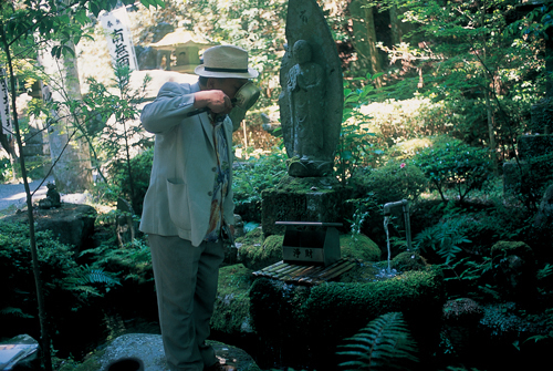 両子寺の奥の院へ続く参道手前に湧く清水をいただく筆者。あたりは、昼なお暗く、霊気に満ちていた。ところで山頭火はまたの名を「水飲み俳人」と呼ばれ、水ききの達人でもあった