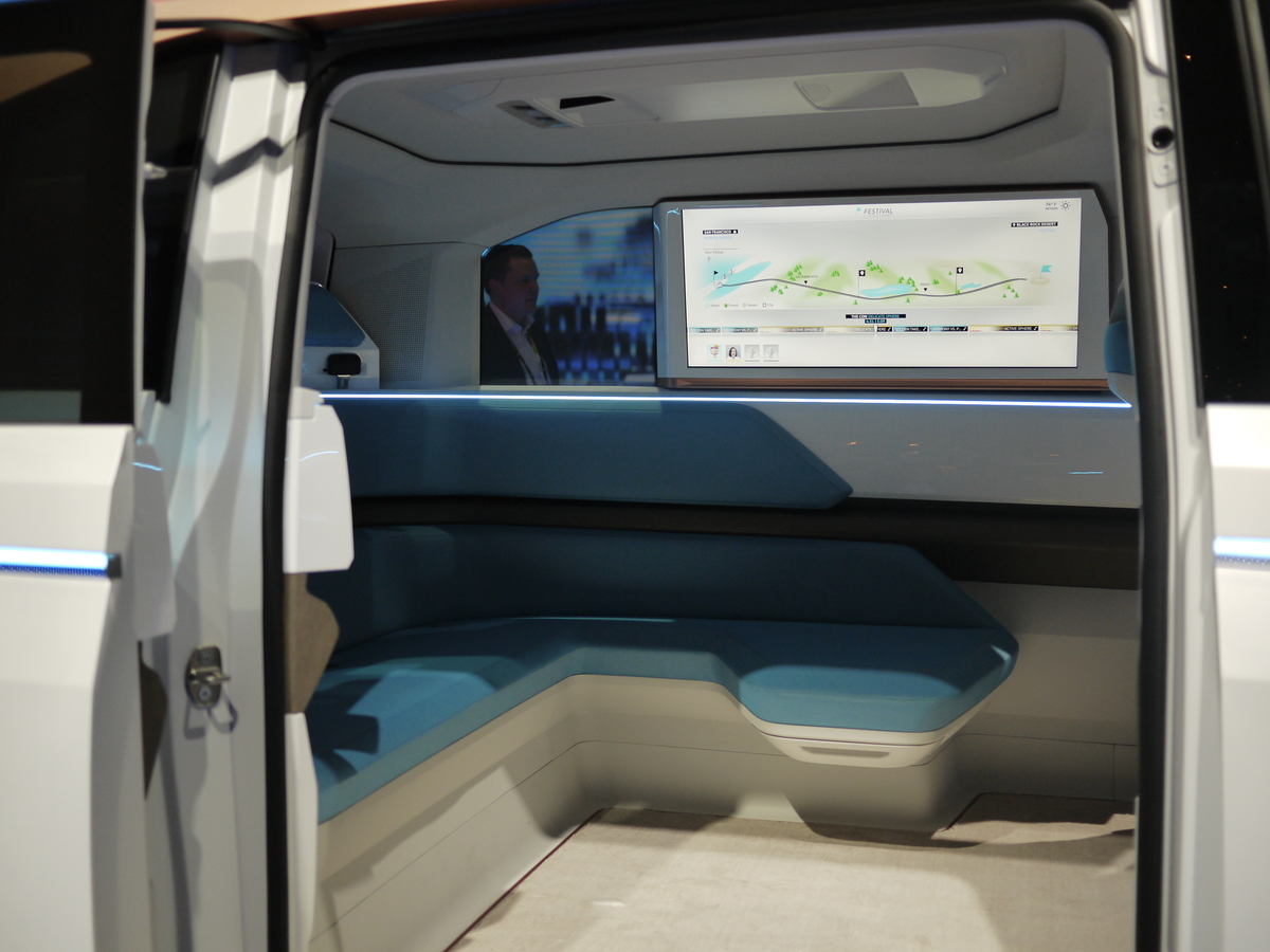 e-Golf Touchが今年中にも実現する近い将来のVWのモデルである一方で、ディエス氏が「ネクスト・ビッグ・ステップ」と呼ぶのがBUDD-e(バディ)コンセプトだ。この車は1960年代に世界中で人気となったVWのフラッグシップ、「ミニバス」を未来によみがえらせるもの。ずばり、仲間と一緒、というのがアイデアの中心となっている。