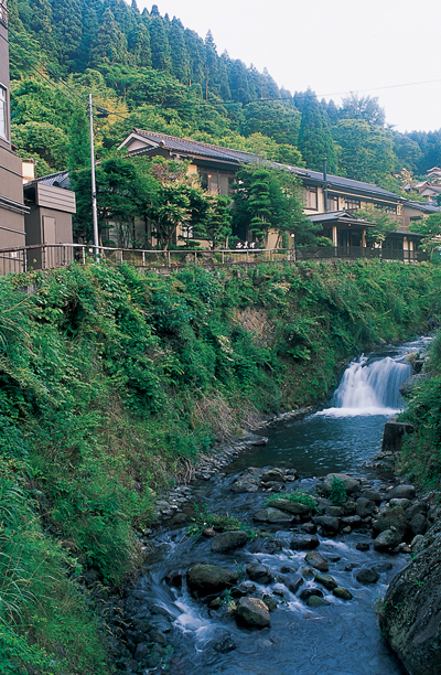 山頭火気に入りの花合野川沿いの湯平温泉街。写真奥が筆者宿泊の「志美津旅館」