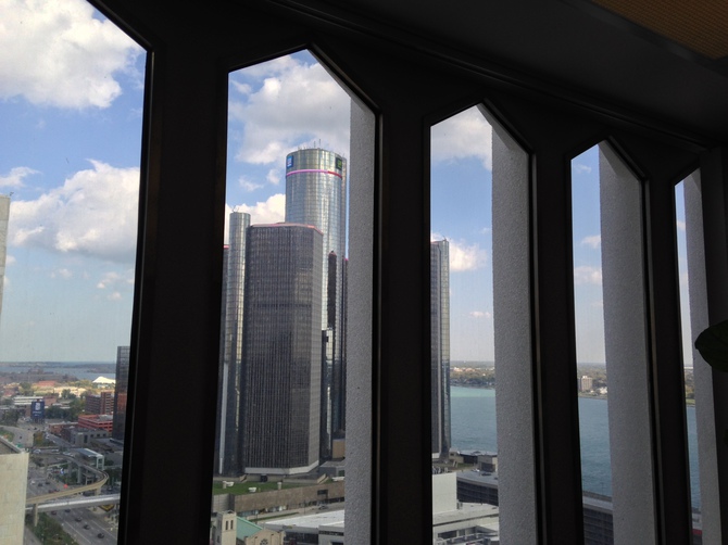 デトロイトのダウンタウンはデトロイト川を南に臨む街である。ミシガン州は五大湖のうち4つの湖に囲まれているが、その中のヒューロン湖から途中のセントクレア湖を経由して(この湖は五大湖の中には数えられない)エリー湖に向かう流れがデトロイト川である。