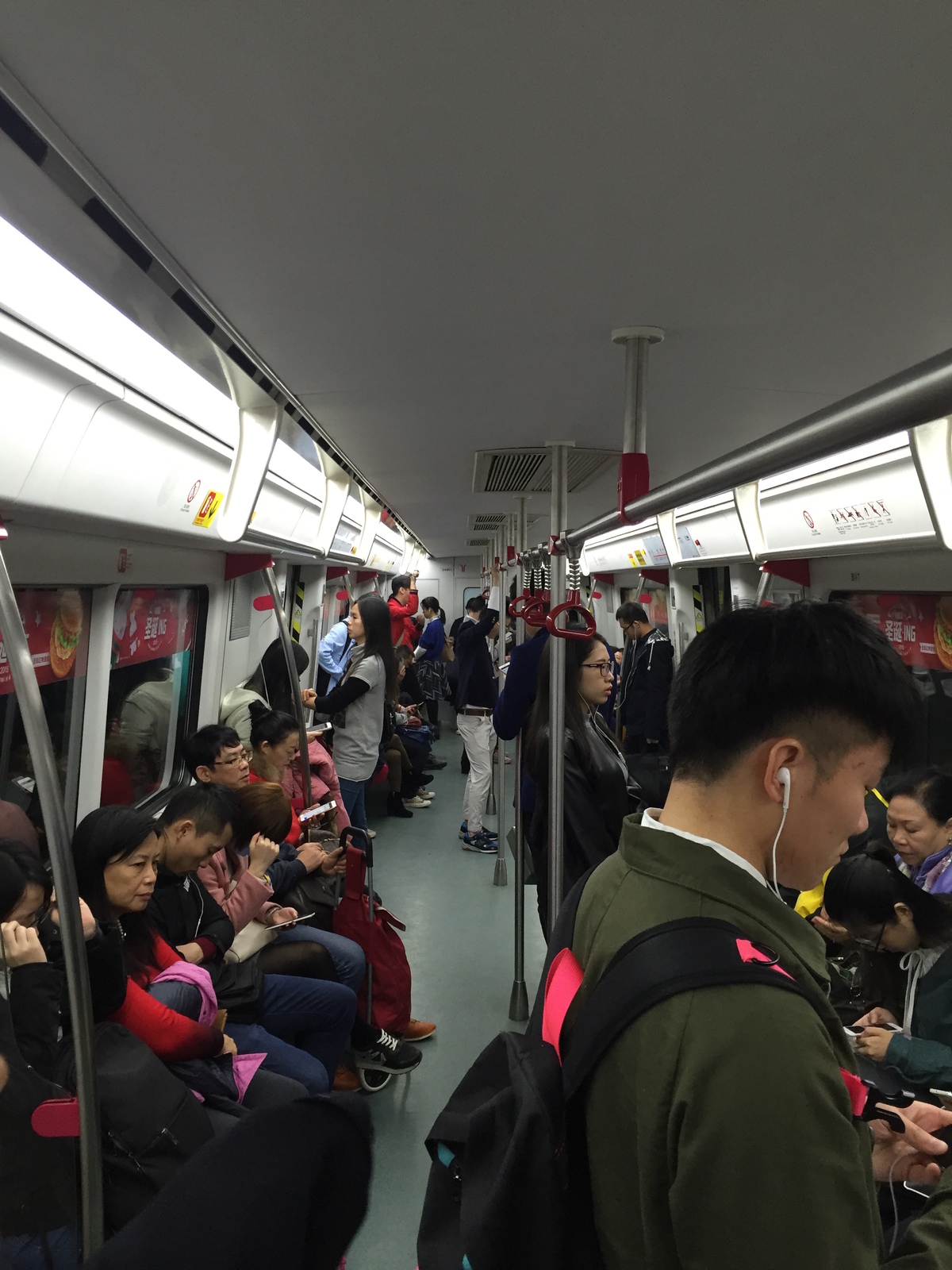 地下鉄車内。多くの人がスマホを見る風景は日本と変わらない