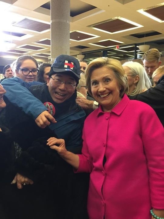 クリントン候補に「戸別訪問を行ってコミットメントカードを集めてきました」と報告すると、同候補は笑顔で「一緒に写真を撮りましょう」と語った(@アイオワ州デモイン歴史博物館)
