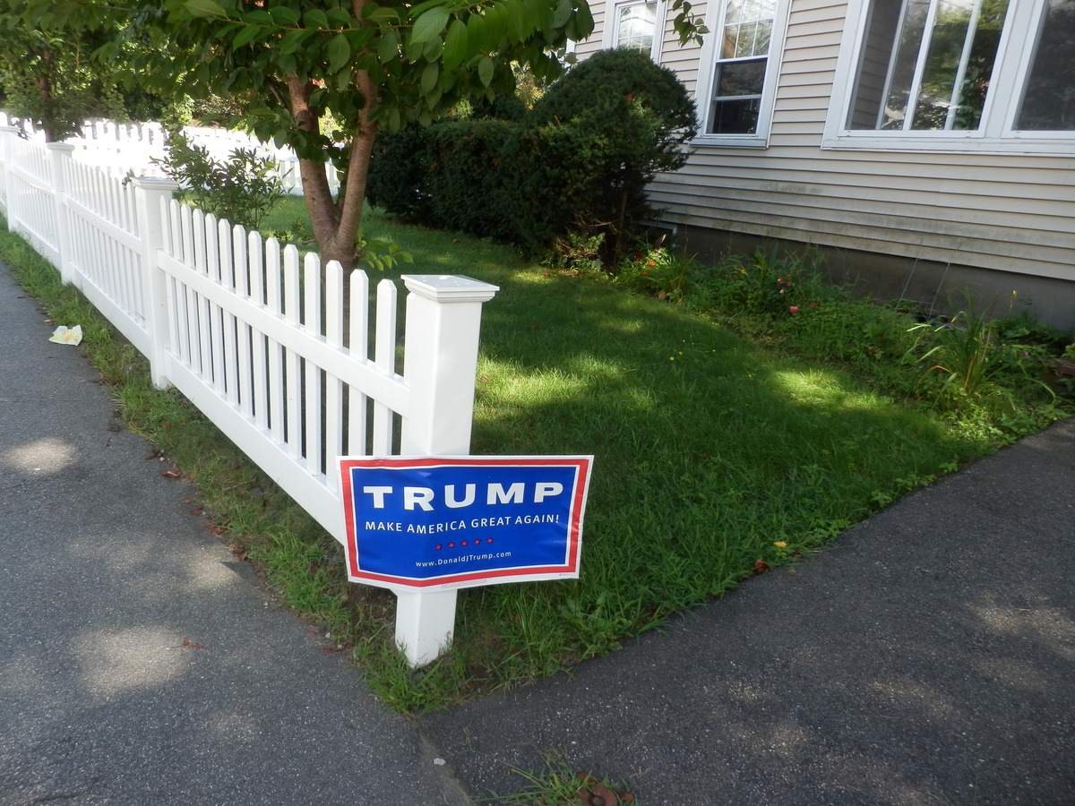 トランプ支持者は、主として白人男性で高卒以下の低所得者です。ニューハンプシャー州コンコードにあるワシントン・ストリートと、ペリー・アベニューの角にある家の前を通りかかったとき、30代前半に見える白人男性の労働者から突然声をかけられました。