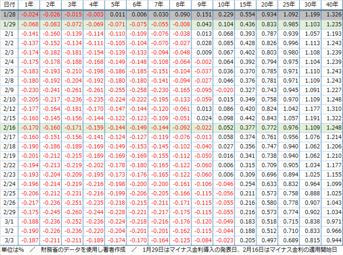 国債市場では、マイナス金利導入発表前まで、4年物まではマイナス利回りでも5年物以上はプラスの利回りを維持していたが、マイナス金利導入発表と同時に8年物までがマイナス利回りとなり、マイナス金利導入後の2月24日以降は10年物まで全てがマイナス利回りという状況が続いている。また、少しでも金利を得ようとさらに期間の長い国債を買い求める動きが15年物から40年物までの超長期国債の利回りも大幅に低下させてきた。