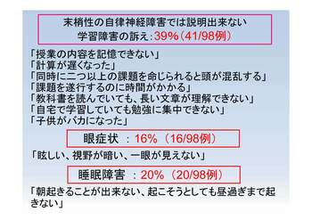 「脳障害」としている21例のうち、画像検査で異常が見られたのは結局、何例だったのだろう。発表では明らかにされていない。その上、患者の共通項としている高次脳機能検査の処理速度は、被験者の意欲にも左右される。末梢性の自律神経障害では説明できない学習障害があった症例41例のうち、なぜその一部の21例のみ「脳障害」となったのかも不明だ。