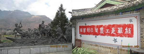(写真左)少数民族の地元の若者が舟を漕いで紅軍兵士を載せて渡河した様子を描いた社会主義的写実主義の群像(写真右)記念館の建物に復元された往時のスローガン「紅軍は我々労働者農民の軍隊 である」