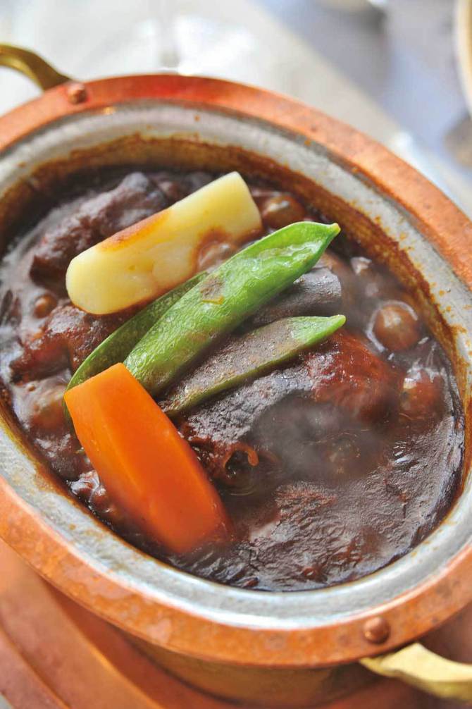 平日の午後2時、3時といった時間にも、客足は絶えない。ビーフシチューは店が独自に開発した一人用の特殊な銅鍋で供され、テーブル上で温め続けられる。クレープシュゼットは客の前でフランベされ、炎が燃え上がるたびに歓声が─。客本位のサービスが行き届いていることが、この店の魅力だろう。