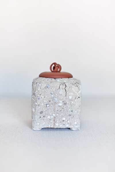 佐渡の岩石を素材にした「佐渡ケ島」シリーズの作品「佐渡ケ島香炉」。上部の箆(へら)目状の凹みは融点の低い岩石が溶けて消失した結果。消失を意識的に造形に取り入れた前衛作品が、この上ない静謐感を漂わせる